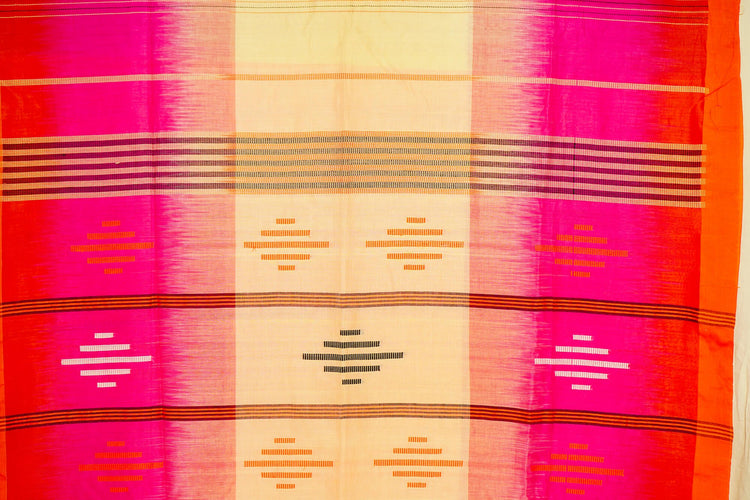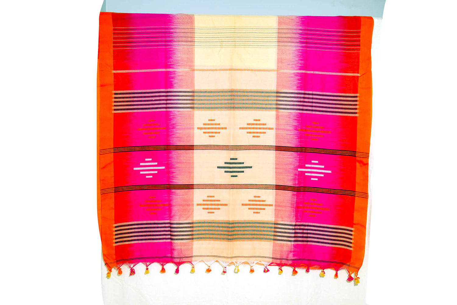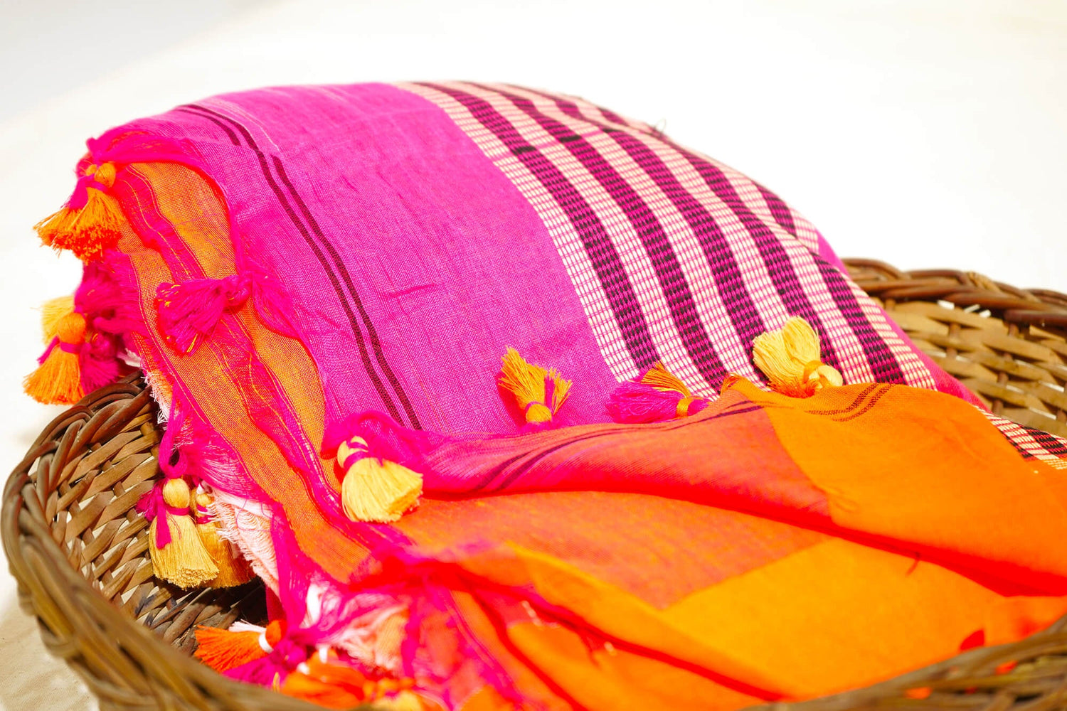 West bengal holds a special place in the heart of handloom lover. The handloom cotton saree from west bengal are particularly famous for their exceptional craftsmanship as well as the fine quality of muslin and cotton. The begampuri cluster, named after the eponymous begampur in the Hoogly district of west bengal, is well known for its bright and colorful combinations, intricate stipes and the serrated extra weft border designs.