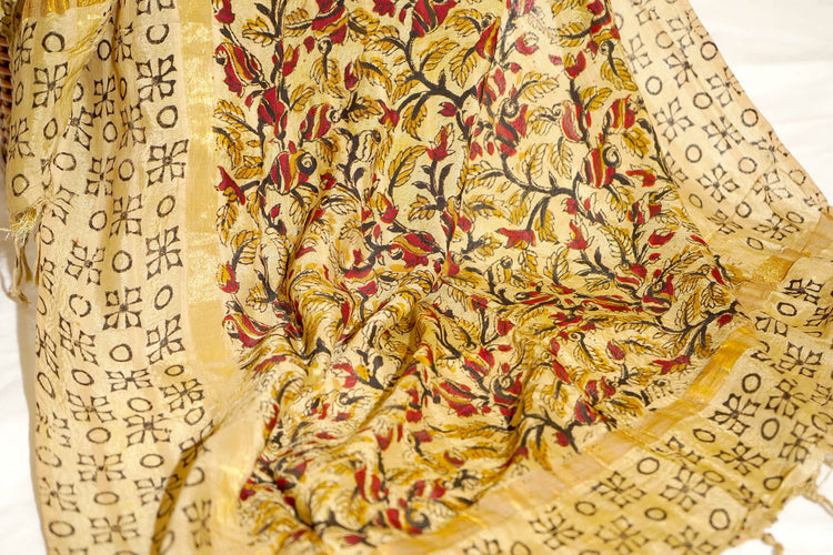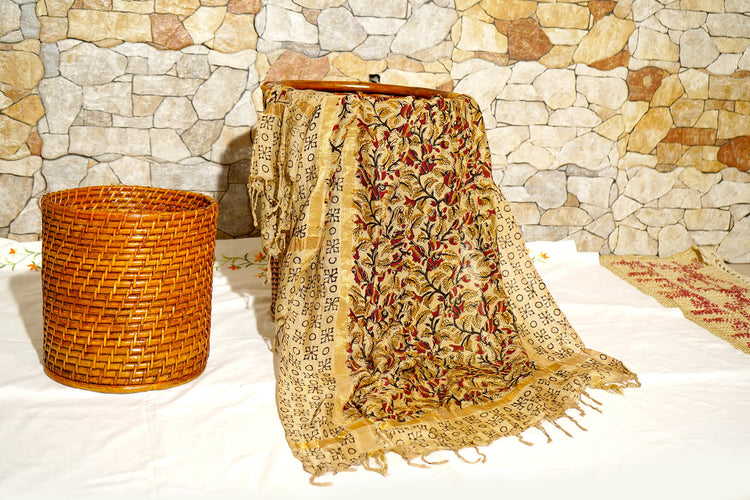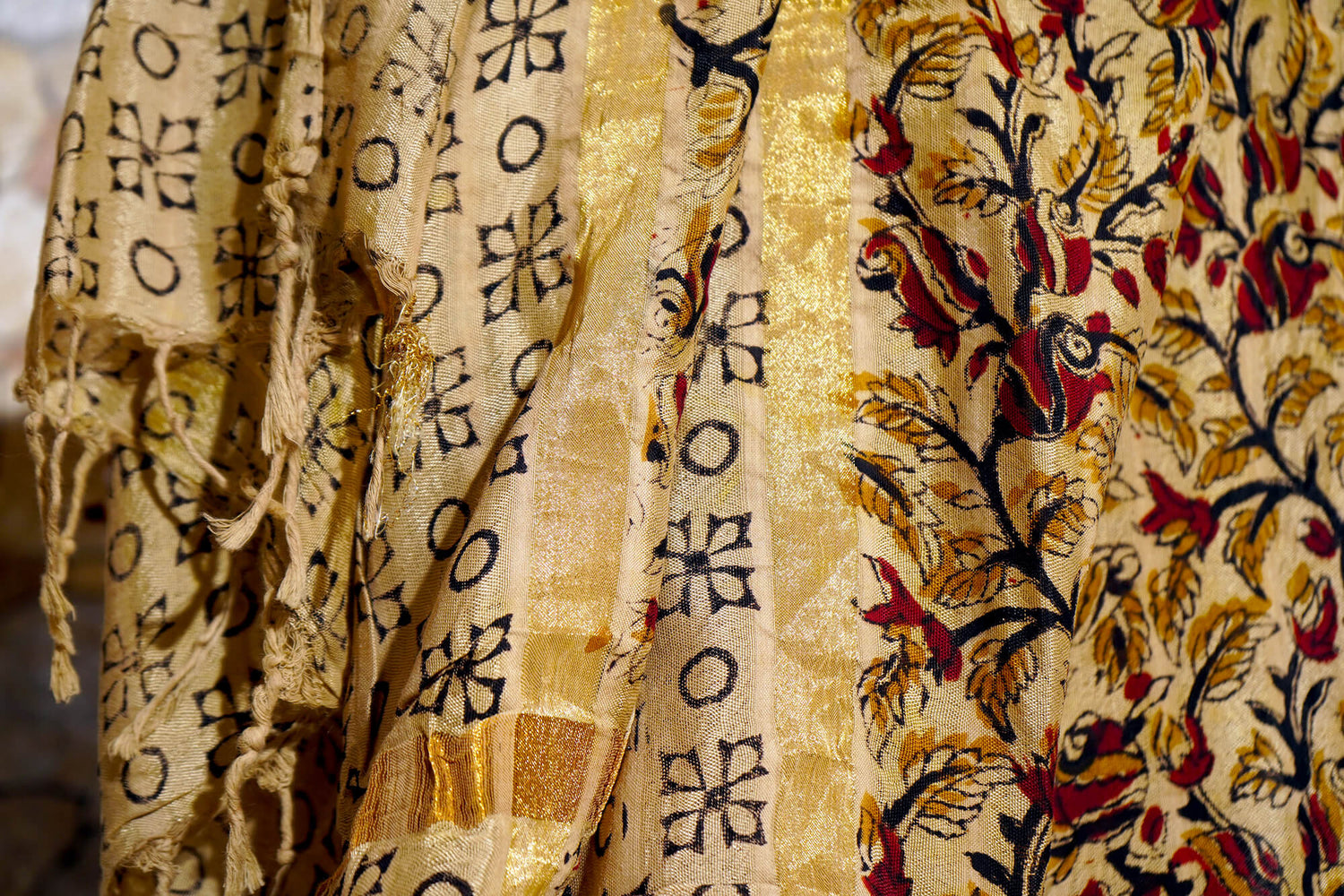 Kalamkari is a type of hand-painted or block-printed cotton textileproduced in Isfahan, Iran, and in the Indian state of Andhra Pradesh. Onlynatural dyes are used in Kalamkari, which involves twenty-three steps. Thereare two distinctive styles of Kalamkari art in India - Srikalahasti style andthe Machilipatnam style. The Srikalahasti style of Kalamkari, where the "kalam" or penis used for freehand drawing of the subject and filling in the colors, isentirely hand worked. This style flourished in temples where Gods andGoddesses, Scenes of Ramayana, Mahabharata etc were painted.Machilipatnam style – Pedana Kalamkari involves vegetable dye blockedpainting of a fabric. It is produced at Pedana near Machilipatnam in krishnadistrict of Andhra Pradesh. This style evolved during the patronage of Mughal andpracticed by Golconda sultanate.Dyes for the cloth are obtained by extracting colors from various roots,leaves, and mineral salts of iron, tin, copper, and alum.[15] Various effectsare obtained by using cow dung, seeds, plants and crushed flowers to obtainnatural dye. Along with buffalo milk, myrobalan is used in kalamkari. Myrobalanis also used to remove the odd smell of buffalo milk. The fixing agentsavailable in the myrobalan can easily fix the dye or color of the textile whiletreating the fabric. Alum is used in making natural dyes and also whiletreating the fabric. Alum ensures the stability of the color in Kalamkari fabric.