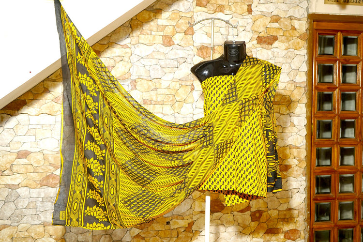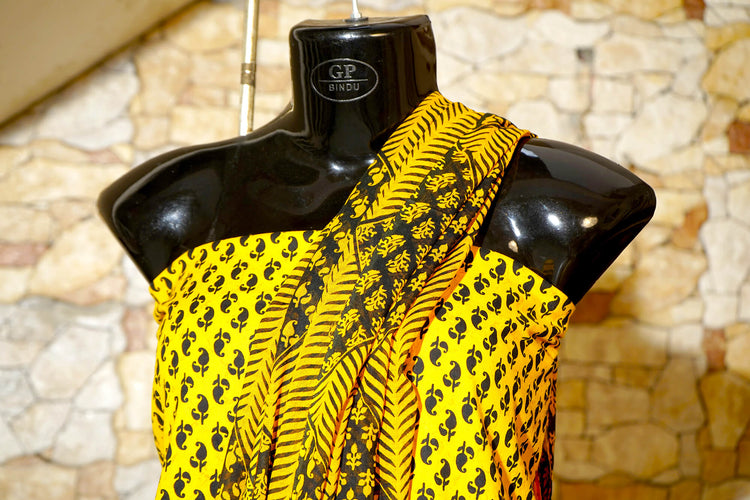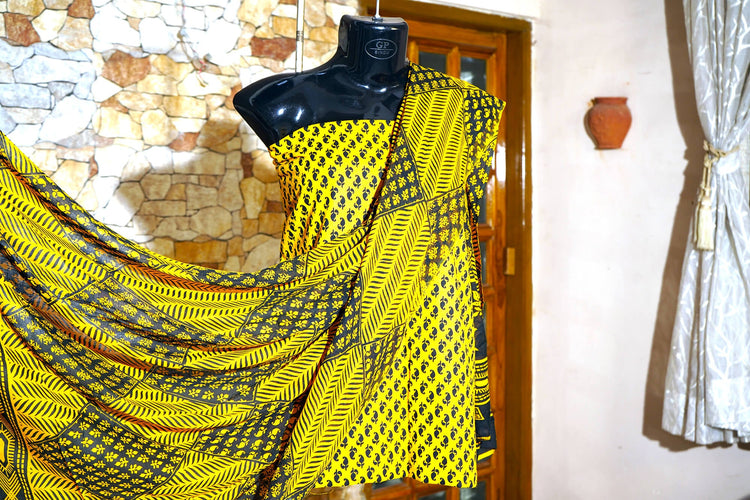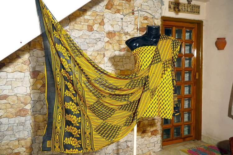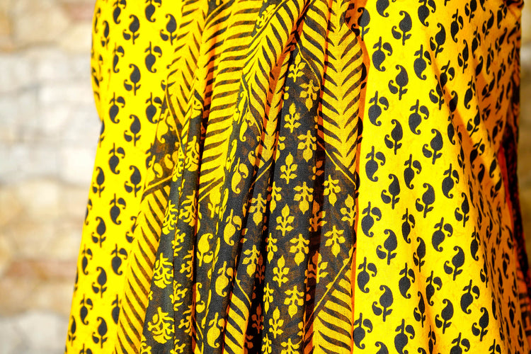 At last a 400 year old craft that has been home to the Chippa community- a clan whose name comes from a Gujarati work meaning 'to print'. Just a few hours drive from the city of Jaipur- resides a village called 'Bagru'. The village welcomes you with a rhythmic beat of blocks and the air smells of drying fabrics. The painstakingly laborious but anciently beautiful process takes around 20 days for the fabric to be completed. The process includes washing - to get rid of the fabric impurities and then Harda is done which leaves a yellow tint. Think of it as a primer. Then the fabric is dried in the sun. Then once the colors are mixed - the printing is started. The printing involves three steps. First the outline is printed, then the block is done and then the insides. Once it is completed, the fabric is dried. The dried fabric is washed in water, then boiled with alizarine where red color acts as a fastener. The main distinguishing feature between Bagru & Sanganer is that Sanganer printing is done on a white background whereas Bagru is done on an indigo or dyed background. Local water also has its effects. In the water of Sanganer, the results of block printing are very rich shades of color while at Bagru one finds a reddish hue in the block printing textiles. Water was abundant Sanganer due to which dyeing and printing and washing could be done very easily. In contrast Bagru where water is scarce 'Dhabu' resist printing and indigo work is practised more often. Additionally motifs printed at Bagru are large with bold lines as compared to Sanganer where sombre colors and fine lines intricate detailing are practised Sanganeri motifs are based on nature whereas Bagru motifs are geometric.