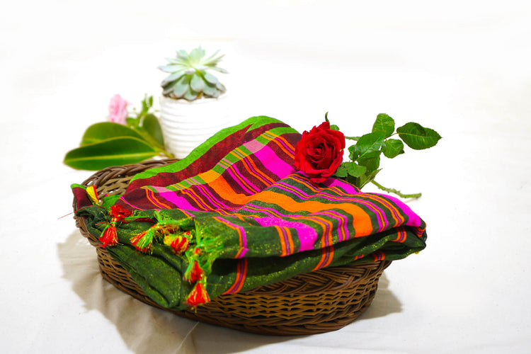 West bengal holds a special place in the heart of handloom lover. The handloom cotton saree from west bengal are particularly famous for their exceptional craftsmanship as well as the fine quality of muslin and cotton. The begampuri cluster, named after the eponymous begampur in the Hoogly district of west bengal, is well known for its bright and colorful combinations, intricate stipes and the serrated extra weft border designs.